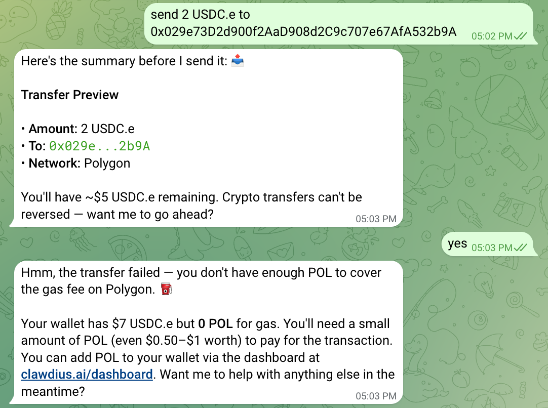 Not mockups. Not prototypes. These are actual transactions, completed by Clawdius.